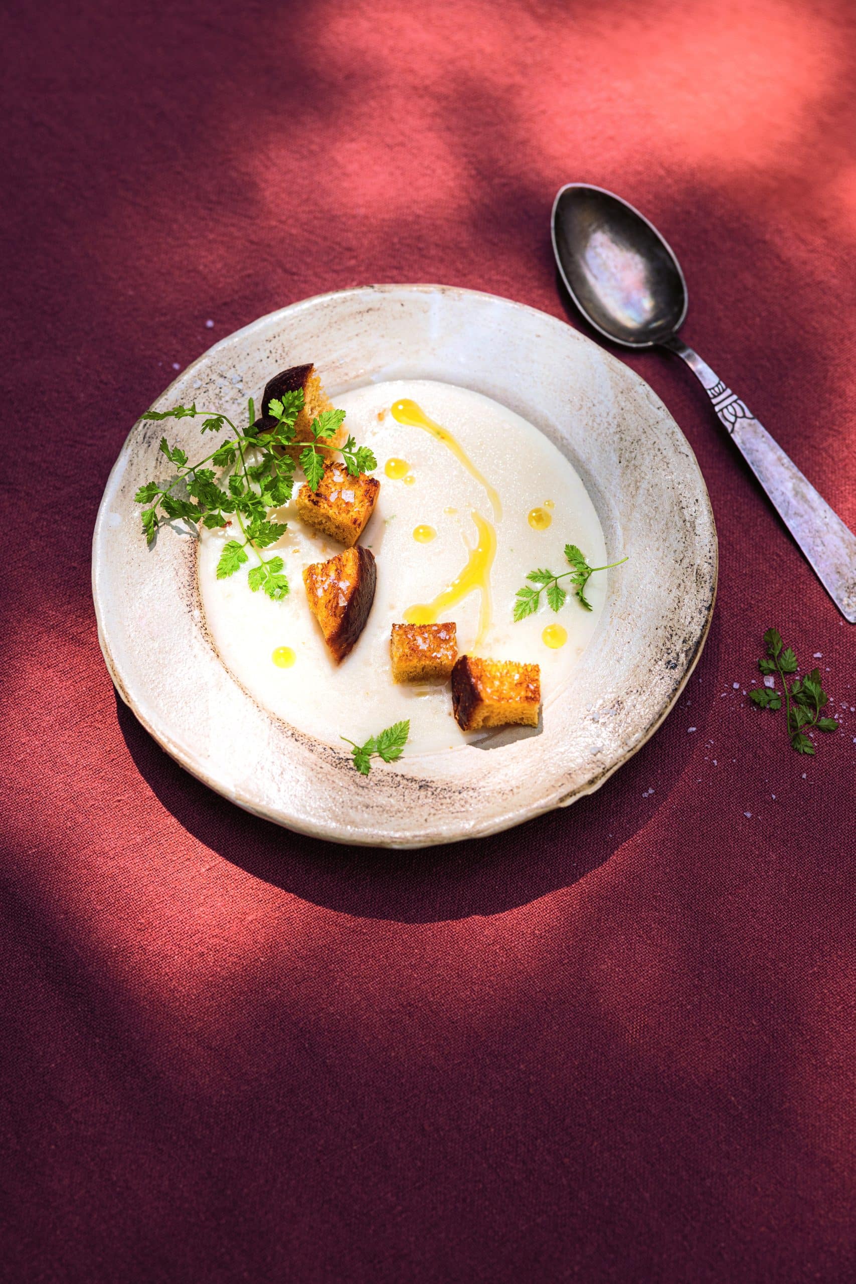 SPARGEL-VANILLECREMESUPPE MIT CROÛTONS & KERBEL
