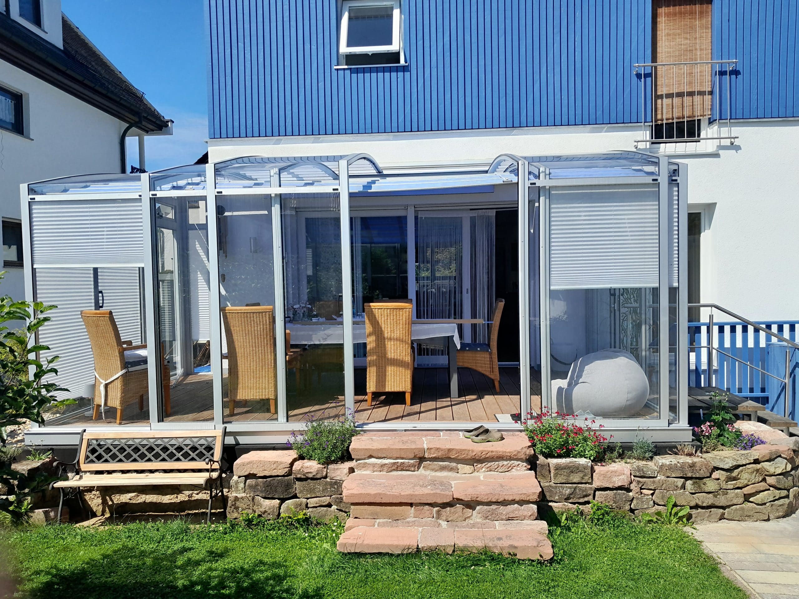 Die TOPAS solar veranda, die Solarveranda mit geraden Seiten, ist auch für Balkone geeignet. Über die leicht gebogene, transparente Dachfläche wird bei Sonneneinstrahlung Wärme generiert – selbst im Winter. So können Sie Ihre Terrasse das ganze Jahr über wetterunabhängig genießen. Bei Hitze lassen sich die Dachelemente komplett zur Seite schieben, während die Beschattung geführt und sturmsicher in den Profilen bis zur Kante läuft. Im Sommer überspannt die Markise den geöffneten Dachbereich, für die geraden Seitenwände empfehlen sich handelsübliche Plissees. Mit integrierter Ambiente-Beleuchtung wird ein Glas Wein am Abend zum intimen Moment.